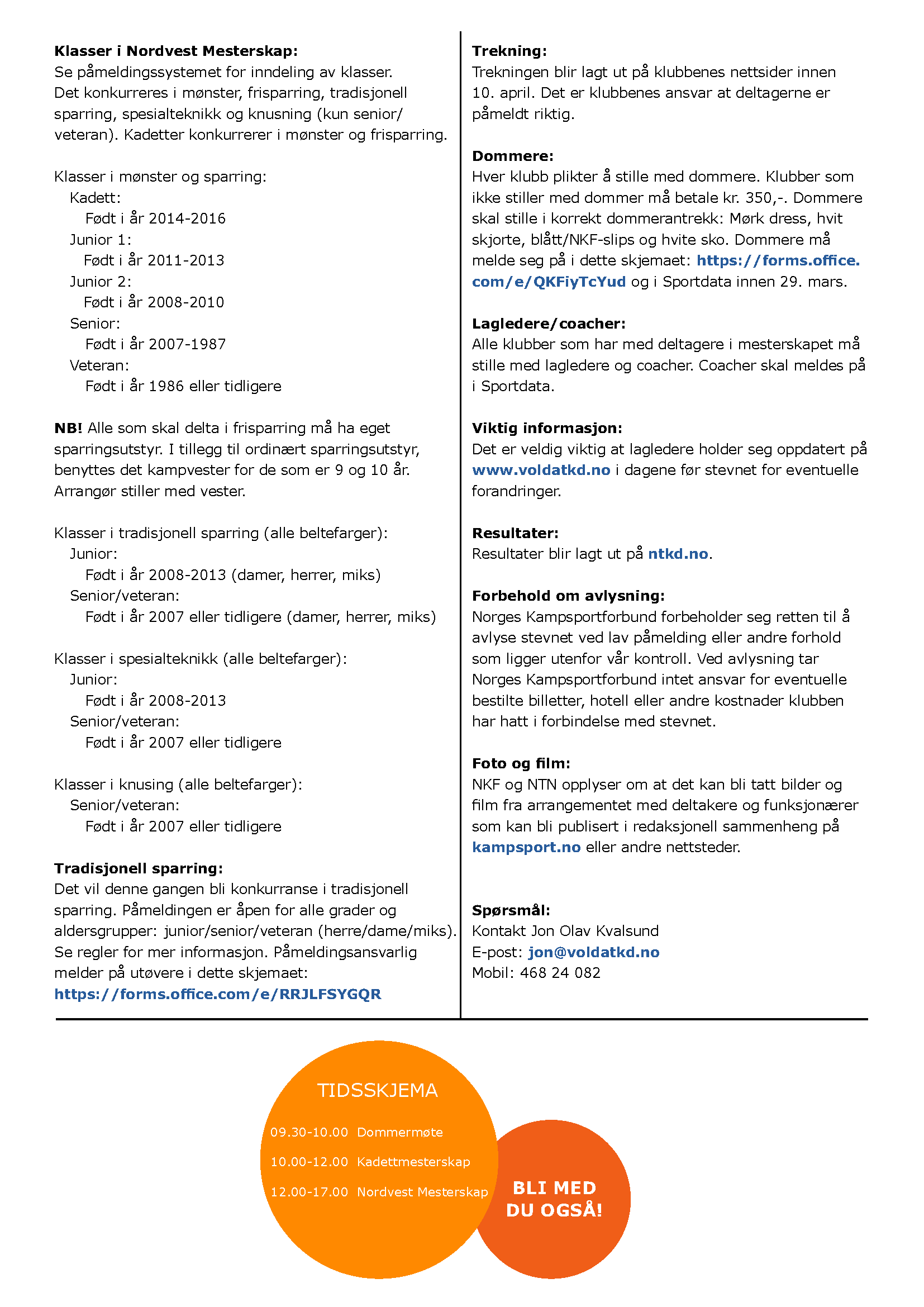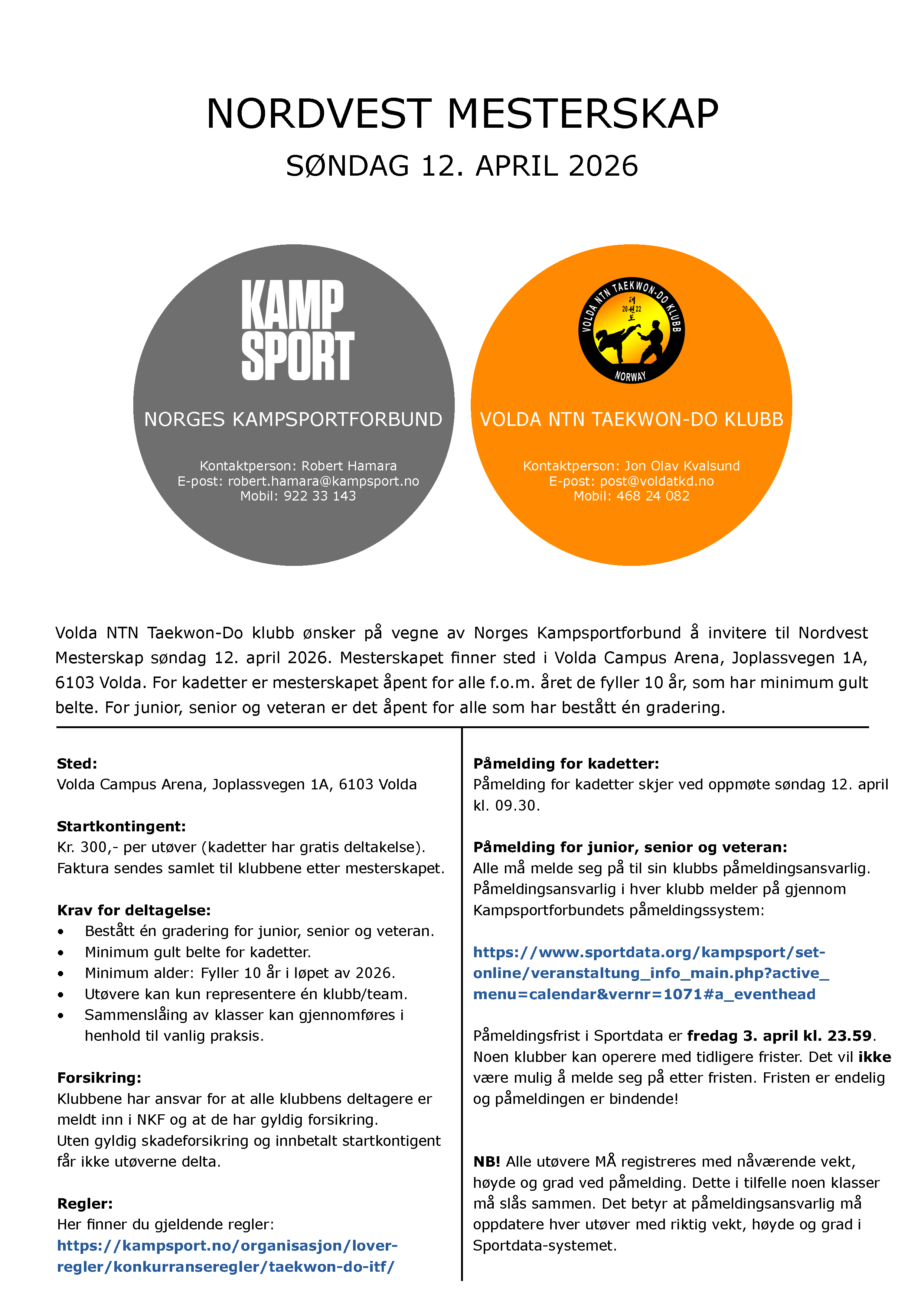 For alle utøvere fra Volda NTN Taekwon-Do klubb gjøres påmeldingen innen torsdag 2. april kl. 23.59: Nordvest - Påmelding for Volda